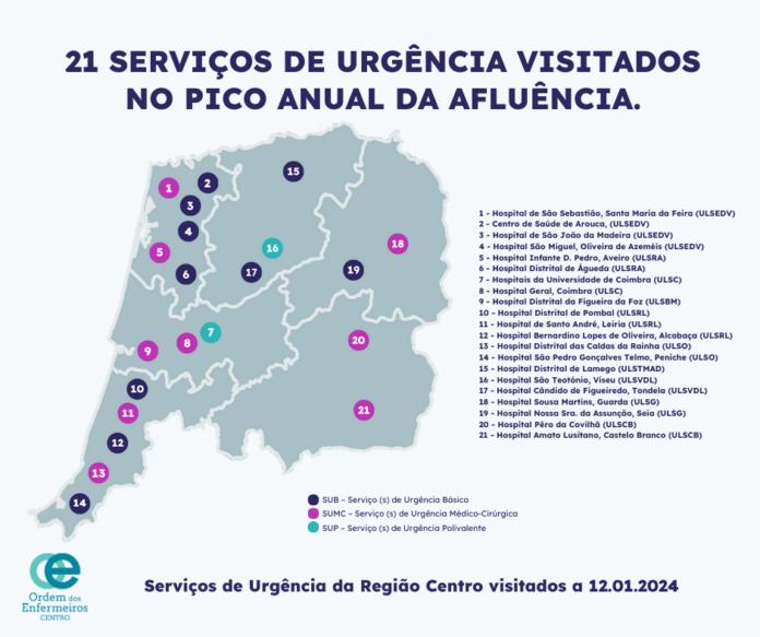 A Secção Regional Centro (SRCentro) da Ordem dos Enfermeiros divulgou os resultados de uma visita abrangente realizada a 21 Serviços de Urgência (SU) na região Centro, durante o pico do inverno, numa altura de elevada pressão sobre os serviços devido à alta incidência de infeções respiratórias agudas. A visita, que teve lugar a 12 de janeiro de 2024, abrangeu dez Serviços de Urgência Básica (SUB), nove Serviços de Urgência Médico-cirúrgica (SUMC) e dois Serviços de Urgência Polivalente (SUP).