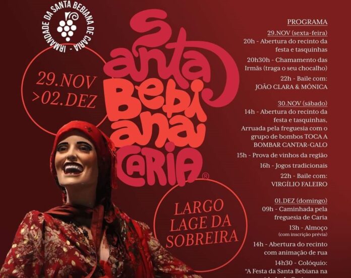 O domingo, dia 1 de dezembro, começa com uma caminhada pela freguesia de Caria, às 9h, seguida de um almoço comunitário (com inscrição prévia). Às 14h, o recinto será reaberto com animação de rua, e às 14h30, um colóquio abordará “A Festa da Santa Bebiana na comunidade de Caria e a sua salvaguarda”. A programação continua com uma peça de teatro intitulada “A Garrafa Divina”, às 19h, junto ao mural de Santa Bebiana.