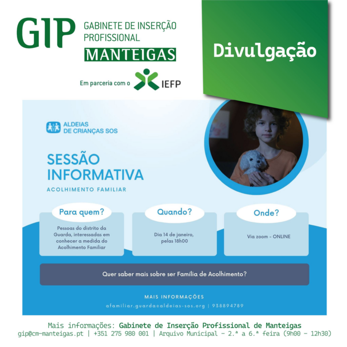 O Gabinete de Inserção Profissional de Manteigas, em parceria com o IEFP e as Aldeias de Crianças SOS, organiza uma sessão informativa online sobre Acolhimento Familiar. O evento é direcionado a pessoas do distrito da Guarda que desejem conhecer melhor esta medida e explorar a possibilidade de se tornarem Famílias de Acolhimento.