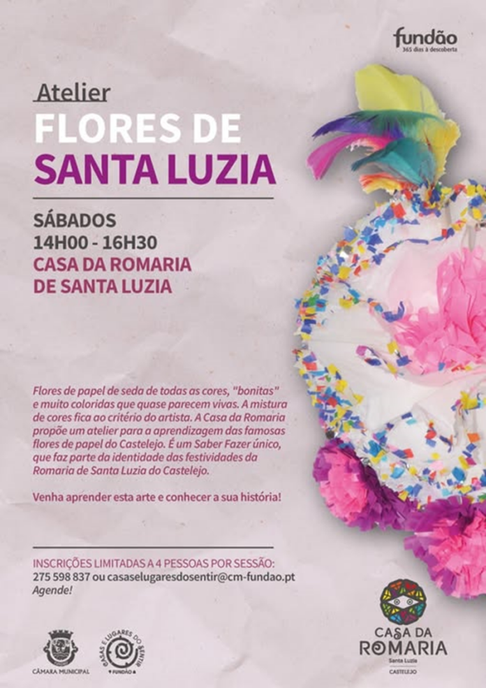 A Casa da Romaria de Santa Luzia, no Castelejo, será palco do atelier “Flores de Santa Luzia”, que terá lugar aos sábados, entre as 14h00 e as 16h30. Esta iniciativa convida os participantes a aprender a arte de criar as icónicas flores de papel do Castelejo, elementos essenciais das festividades da Romaria de Santa Luzia e parte integrante da identidade cultural da região.