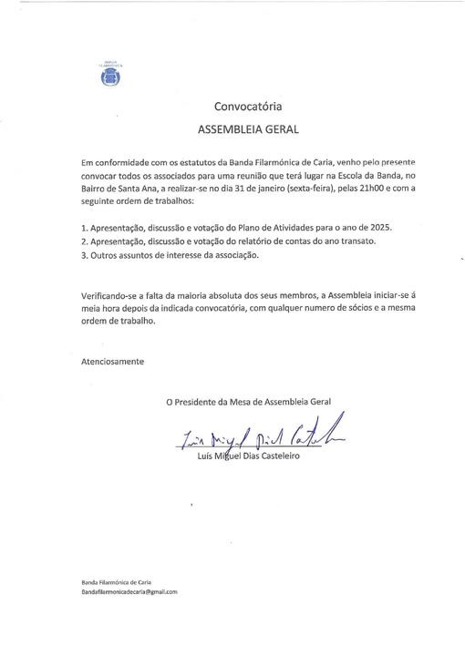 A Banda Filarmónica de Caria irá realizar a sua Assembleia Geral no próximo dia 31 de janeiro de 2025 (sexta-feira), pelas 21h00, na Escola da Banda, situada no Bairro de Santa Ana.