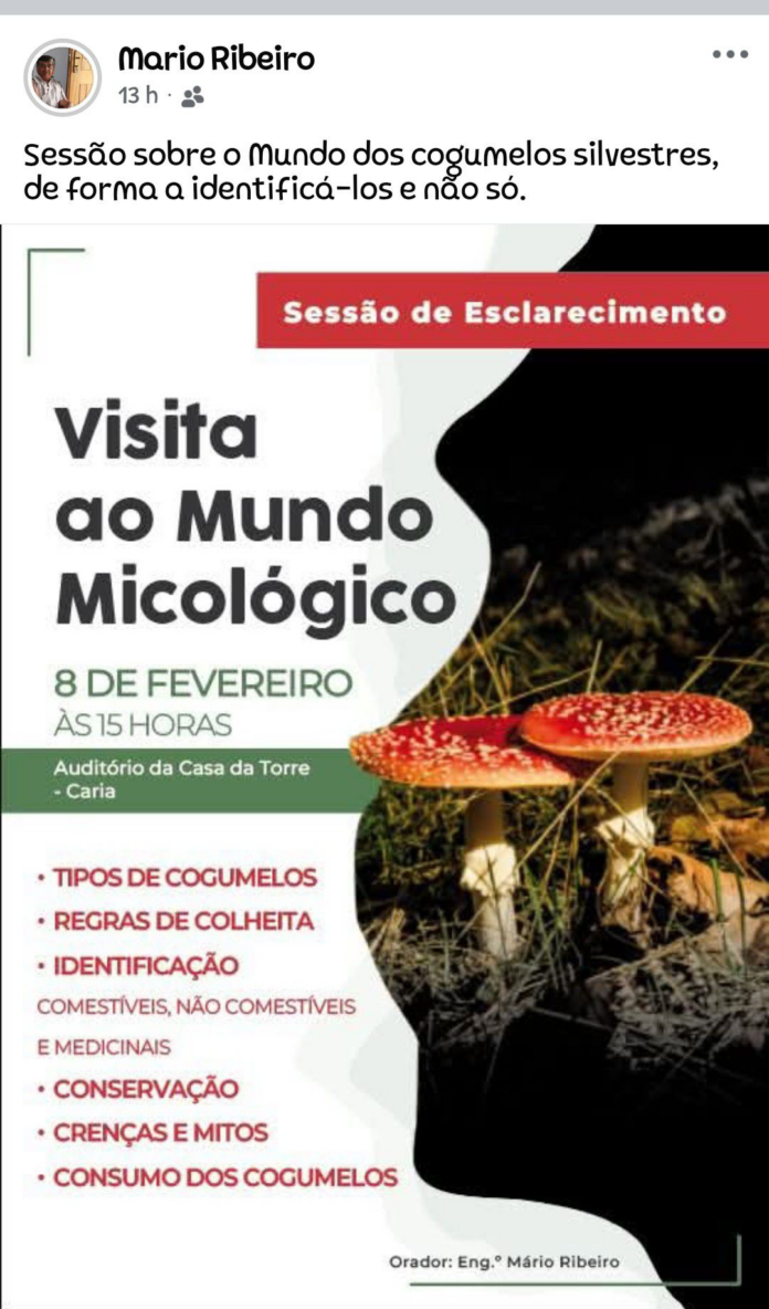 No próximo dia 8 de fevereiro, às 15h, realiza-se no Auditório da Casa da Torre, em Caria, uma sessão de esclarecimento intitulada “Visita ao Mundo Micológico”.