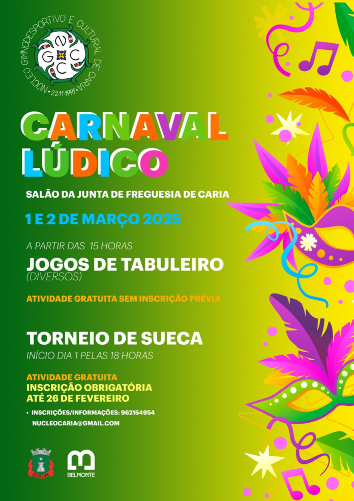 Nos dias 1 e 2 de março, o Salão da Junta de Freguesia de Caria será palco do Carnaval Lúdico, um evento organizado pelo Núcleo Gimnodesportivo e Cultural de Caria.