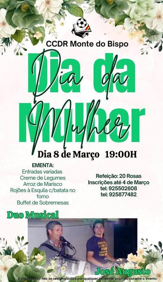 A CCDR Monte do Bispo organiza um evento especial para celebrar o Dia da Mulher, no dia 8 de março, às 19h00. A noite contará com um jantar cuidadosamente preparado e animação musical ao vivo, prometendo momentos de convívio e diversão.