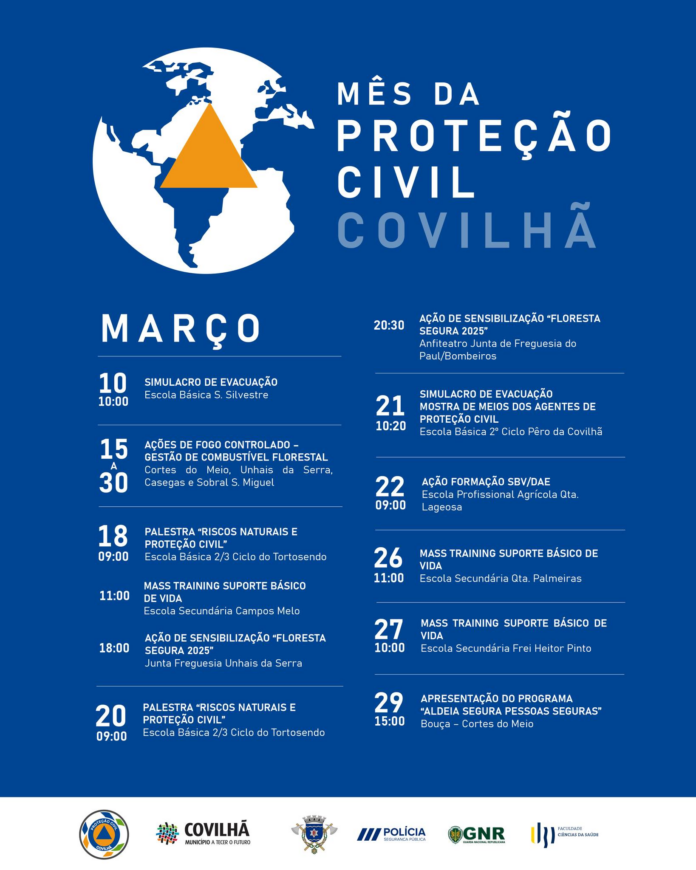 No dia 10, às 10:00, a Escola de São Silvestre recebe um simulacro de evacuação em cenário de incêndio. Seguem-se outras atividades, como a palestra “Riscos Naturais e Proteção Civil” na Escola Básica 2/3 do Tortosendo (dias 18 e 20), e um ‘Mass Training’ de Suporte Básico de Vida na Escola Secundária Campos Melo (dia 18), que também decorrerá noutras escolas ao longo do mês.