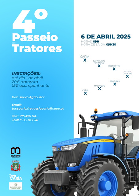 O 4.º Passeio de Tratores em Caria está marcado para o dia 6 de abril, com saída às 9h30. O evento promete um percurso pelas localidades da região, incluindo Belmonte, Carvalhal Formoso, Malpique e Peibereiras, com momentos de convívio e visitas guiadas.