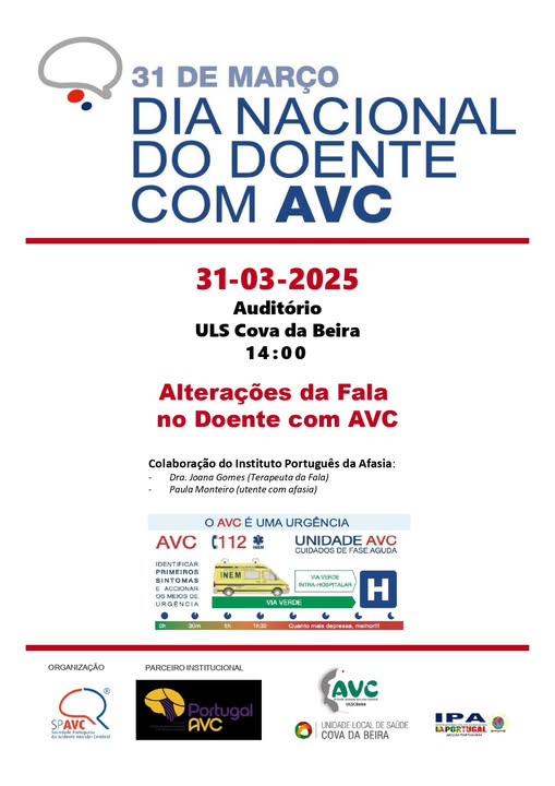 No âmbito do Dia Nacional do Doente com AVC, a Unidade de Acidente Vascular Cerebral da ULS da Cova da Beira organiza, no dia 31 de março de 2025, às 14h00, a sessão informativa “Alterações da Fala no Doente com AVC”. O evento terá lugar no Auditório do Hospital Pêro da Covilhã e pretende sensibilizar para as dificuldades de comunicação após um AVC, bem como a importância do diagnóstico e tratamento adequados.