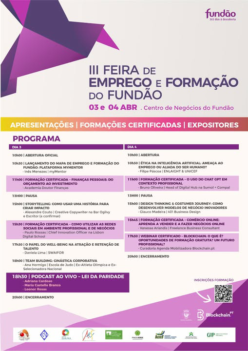 A cidade do Fundão recebe nos dias 3 e 4 de abril de 2025 a II Feira de Emprego e Formação, que decorrerá no Centro de Negócios e Serviços do Fundão. O evento é de participação gratuita e está aberto ao público, proporcionando oportunidades de capacitação, requalificação profissional e contacto direto com empresas e instituições da região.