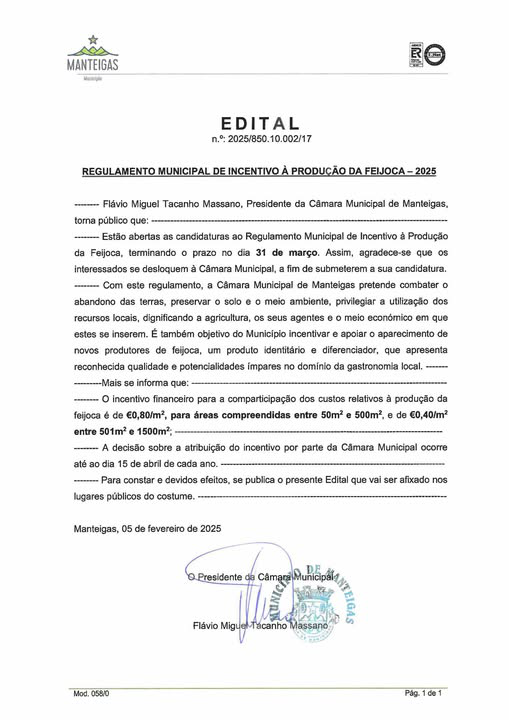 O Município de Manteigas informa que estão abertas as candidaturas para o Regulamento Municipal de Incentivo à Produção da Feijoça para o ano de 2025.