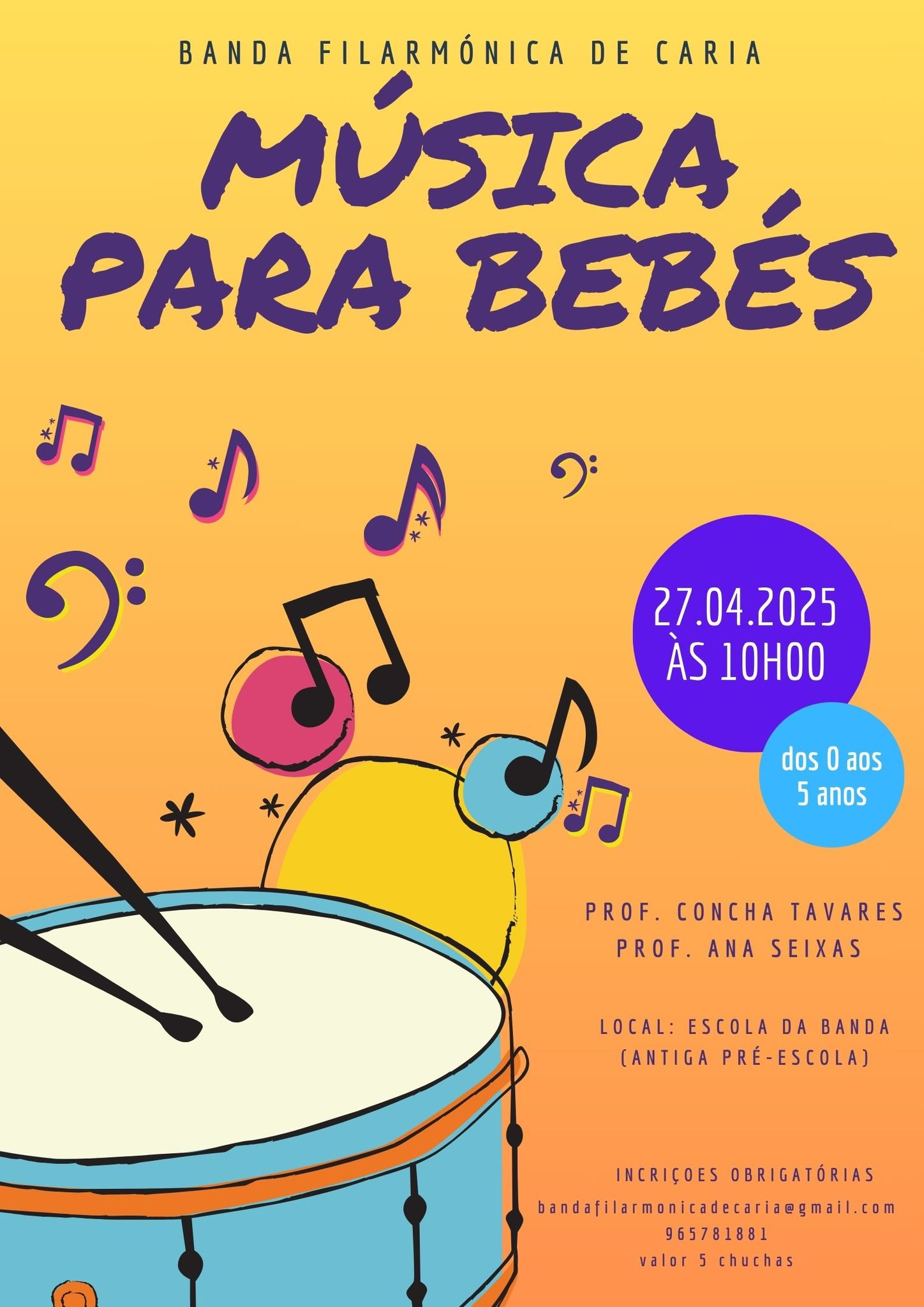 A Banda Filarmónica de Caria vai promover, no dia 27 de abril, um evento especial dedicado aos mais pequenos: “Música para Bebés”. A iniciativa será conduzida pelas professoras Concha Tavares e Ana Seixas, e destina-se a crianças dos 0 aos 5 anos.