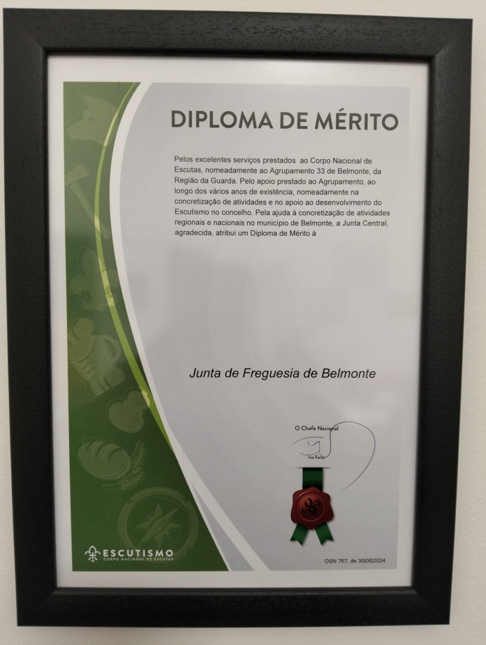 Este reconhecimento enaltece o apoio e a colaboração contínua prestados pela União das Freguesias ao Agrupamento de Escuteiros de Belmonte – CNE 33, refletindo o forte espírito de cooperação e compromisso com os valores do escutismo.