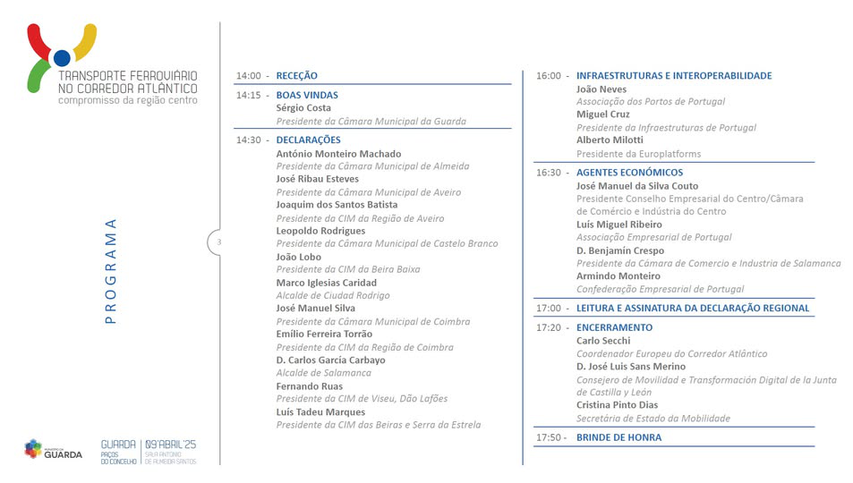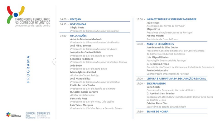 A conferência começará às 14h15, na Sala António de Almeida Santos, na Câmara da Guarda, e será uma oportunidade para debater o desenvolvimento e a importância deste corredor no contexto de integração e crescimento económico da região, bem como a cooperação entre os dois países ao nível das infraestruturas e das redes de transporte.