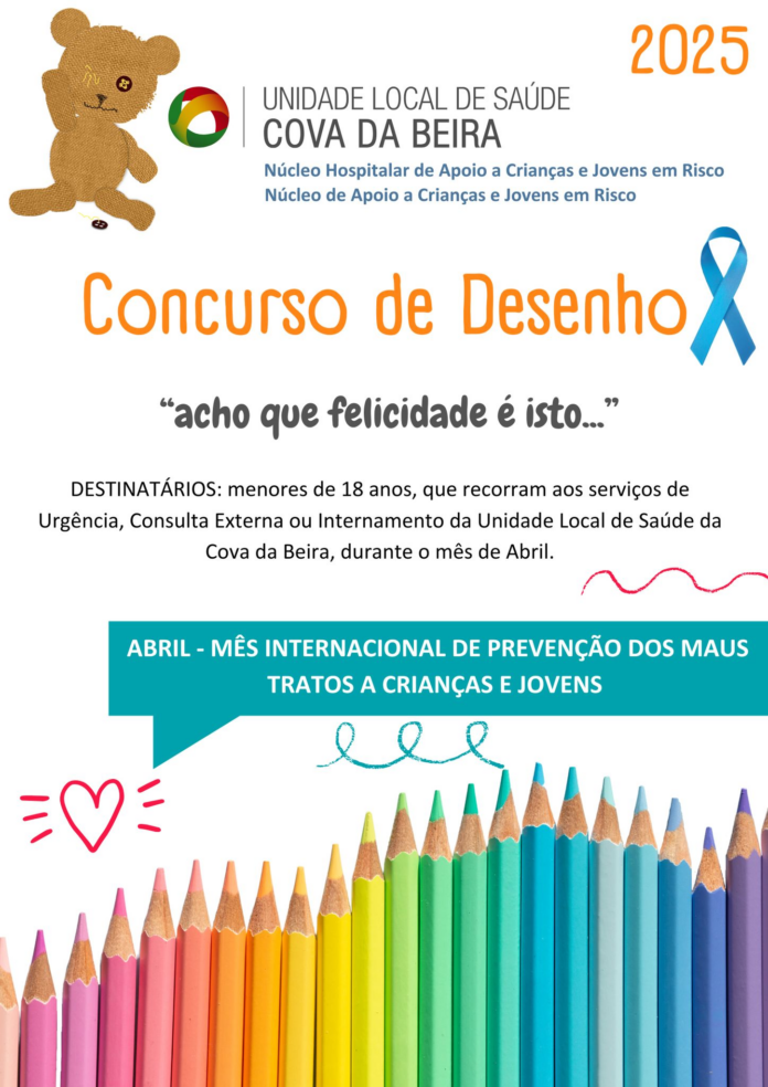 Durante o mês de abril, assinalado como Mês da Prevenção dos Maus Tratos a Crianças e Jovens, a ULS da Cova da Beira lança um desafio especial aos mais novos: o Concurso de Desenho com o tema “Acho que felicidade é isto”.