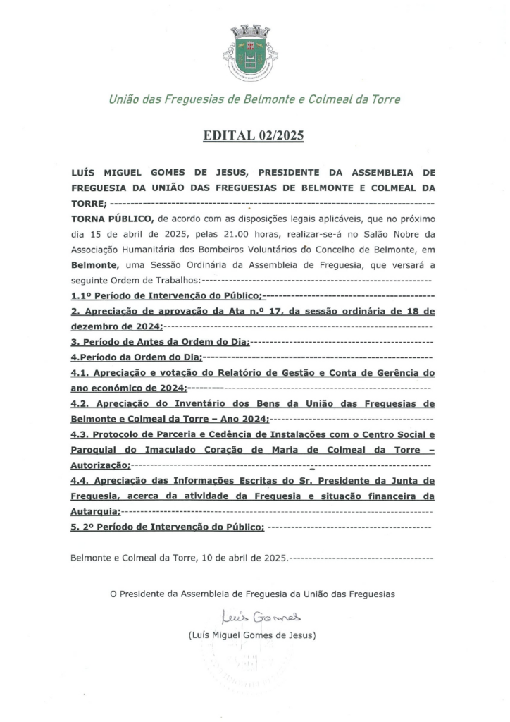 A convocatória foi assinada pelo presidente da Assembleia de Freguesia, Luís Miguel Gomes de Jesus, a 10 de abril de 2025.