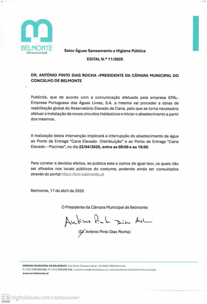 Devido a esta operação, será necessário interromper o abastecimento de água ao Ponto de Entrega “Caria Elevado – Distribuição” e ao Ponto de Entrega “Caria Elevado – Piscinas” no próximo dia 22 de abril, entre as 09:00 e as 19:00.
