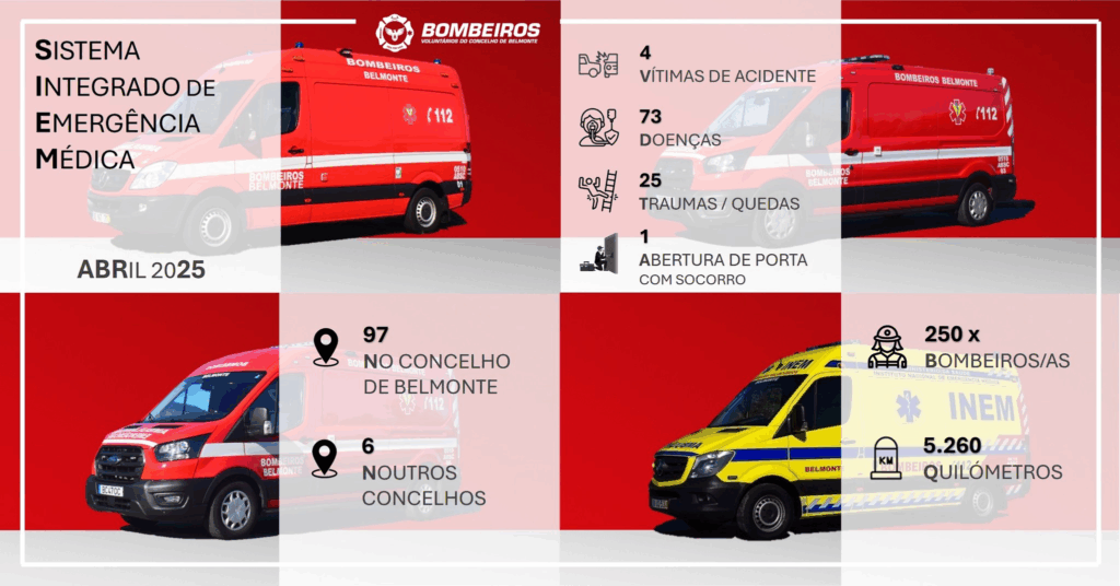 Os Bombeiros Voluntários do Concelho de Belmonte divulgaram o balanço da sua atividade no âmbito do Sistema Integrado de Emergência Médica (SIEM) durante o mês de abril de 2025. Ao todo, foram registadas 103 intervenções, sendo 97 no concelho de Belmonte e 6 em outros concelhos vizinhos.