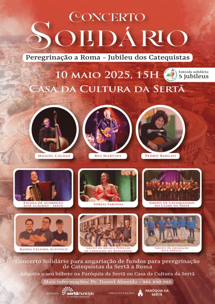 A Paróquia da Sertã vai promover, no próximo dia 10 de maio, um Concerto Solidário com o objetivo de angariar fundos para apoiar o Grupo de Catequistas na sua peregrinação a Roma, no âmbito do Jubileu dos Catequistas, que decorrerá de 26 a 28 de setembro de 2025.