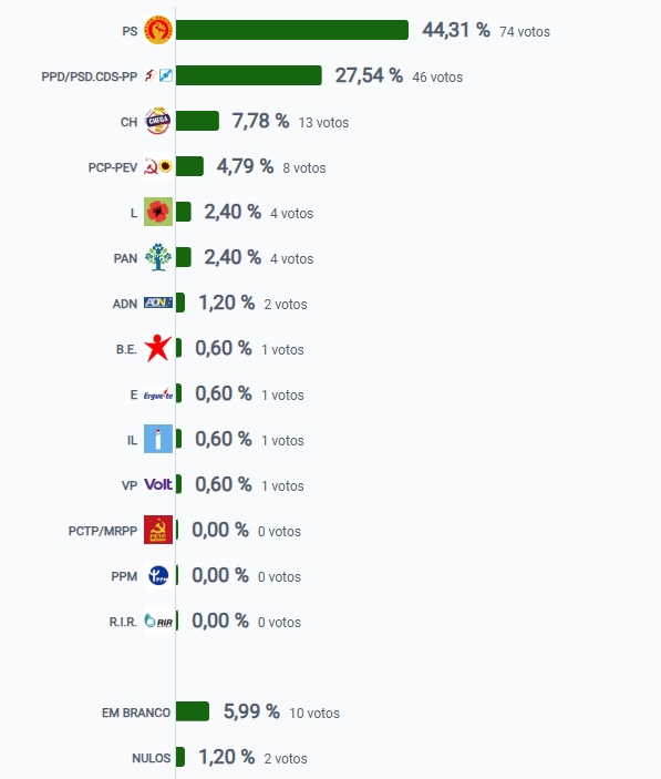 | Bloco de Esquerda (BE) | 53 | 1,57% |