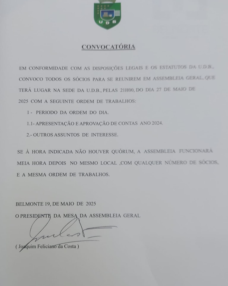 A União Desportiva de Belmonte (U.D.B.) convocou todos os seus sócios para uma Assembleia Geral, a realizar-se no próximo dia 27 de maio de 2025, às 21h00, na sede da associação.