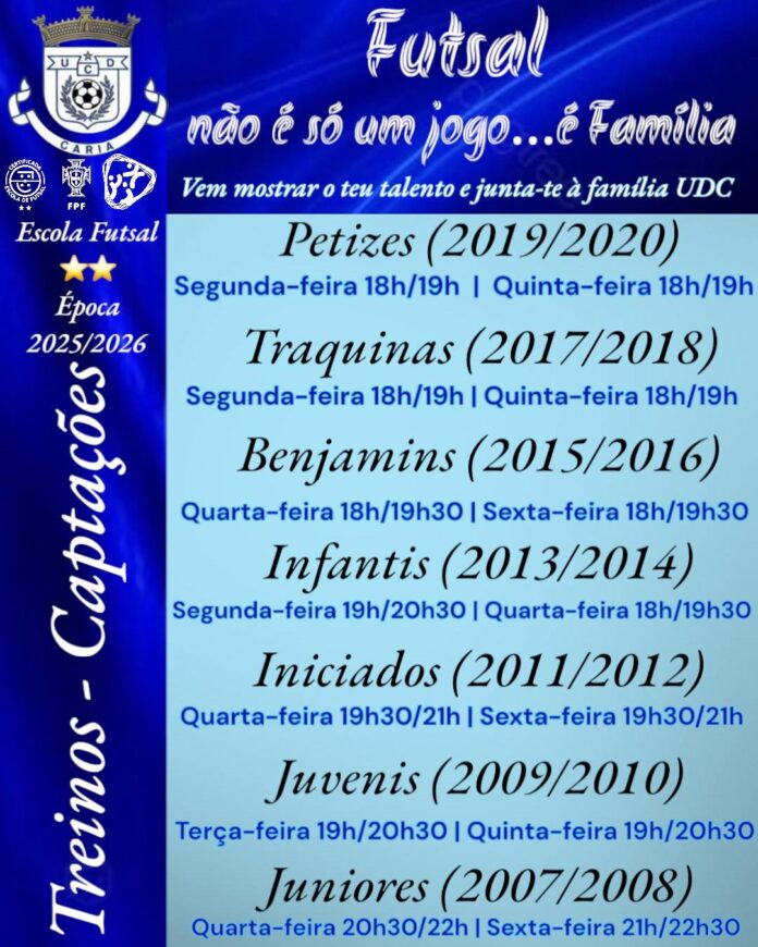A União Desportiva Cariense está a promover treinos de captação para a época 2025/2026, convidando todos os jovens nascidos entre 2007 e 2020 a integrarem os seus escalões de formação em futsal.