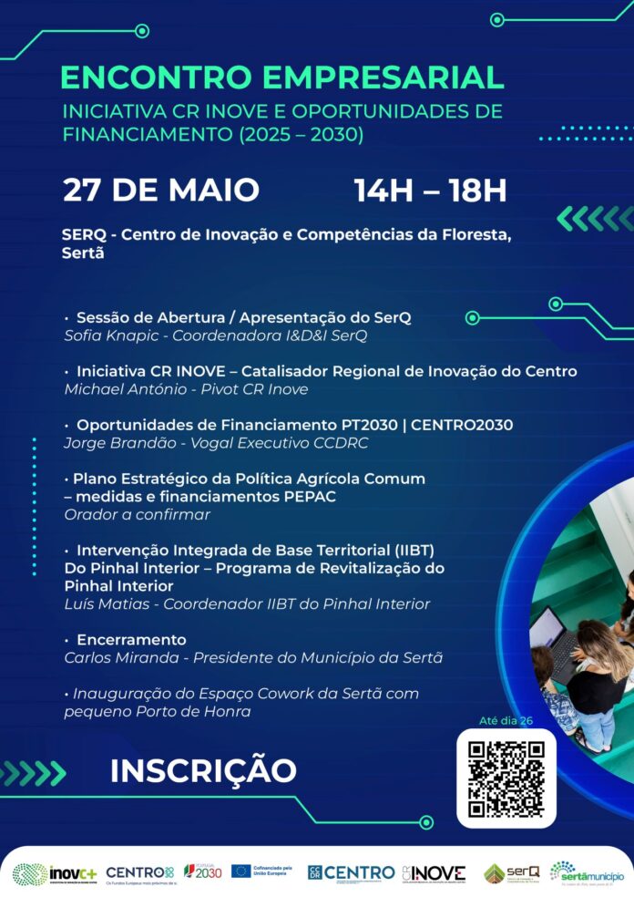 O Centro de Inovação e Competências da Floresta (SerQ), na Sertã, será palco de um Encontro Empresarial no próximo dia 27 de maio, a partir das 14h00, que visa apresentar a iniciativa CR Inove e divulgar oportunidades de financiamento para o período 2025-2030. A sessão contará com a participação de empresários, empreendedores, investidores e representantes de instituições públicas da região Centro.