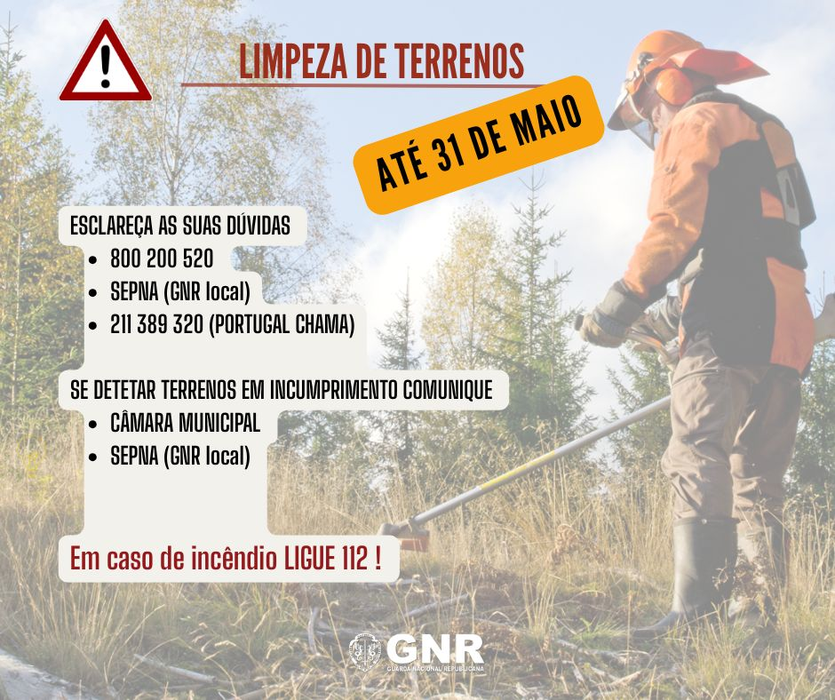 A GNR relembra que os proprietários têm até 31 de maio para proceder à limpeza de terrenos, medida essencial para a prevenção de incêndios florestais.