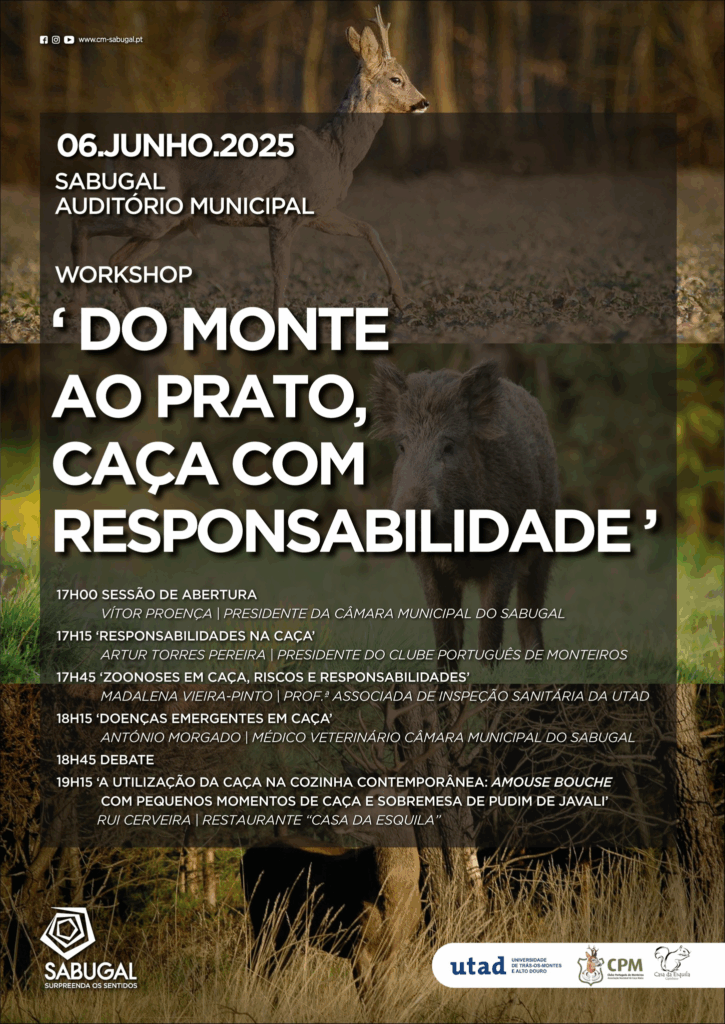 O Auditório Municipal do Sabugal recebe no próximo dia 6 de junho o workshop ‘Do Monte ao Prato, Caça com Responsabilidade’, uma iniciativa que pretende sensibilizar para as boas práticas cinegéticas e a valorização da carne de caça na gastronomia contemporânea.