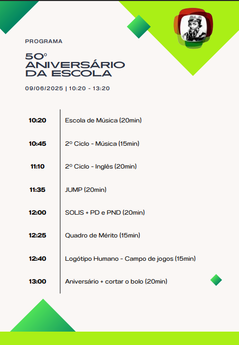 A celebração culmina às 13h00 com o cantar dos parabéns e o corte do bolo, encerrando uma manhã festiva que assinala meio século de história, dedicação e crescimento desta escola emblemática.