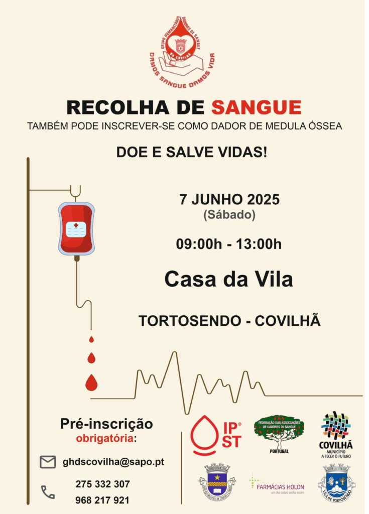 No próximo sábado, 7 de junho de 2025, vai decorrer uma recolha de sangue na Casa da Vila de Tortosendo, no concelho da Covilhã, entre as 09h00 e as 13h00.
