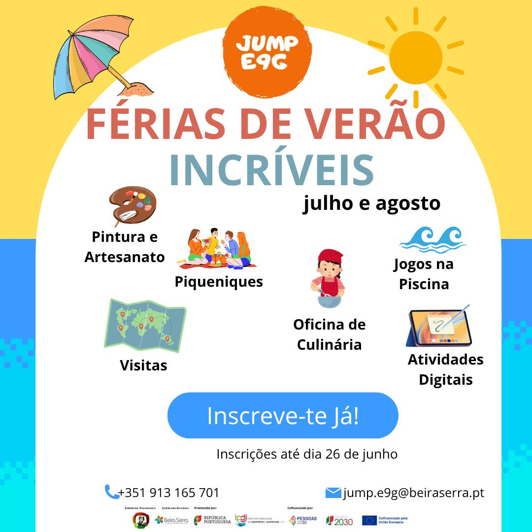 Estão abertas as inscrições para as Férias de Verão Incríveis promovidas pelo Projeto JUMP E9G, que decorrem nos meses de julho e agosto. Um programa pensado para proporcionar dias cheios de diversão, aprendizagem e novas amizades.