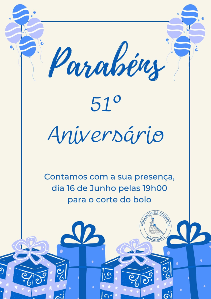 A Associação da Juventude de Maçainhas convida toda a comunidade a juntar-se à celebração do seu 51.º aniversário, que se assinala com um momento especial no dia 16 de junho, pelas 19h00.