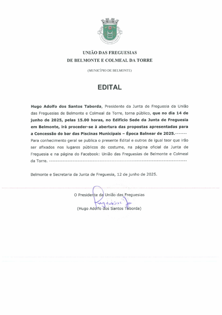 A Junta da União das Freguesias de Belmonte e Colmeal da Torre vai abrir, no próximo dia 14 de junho, pelas 15h00, as propostas apresentadas no âmbito da concessão do bar das Piscinas Municipais para a época balnear de 2025.