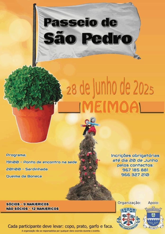 A Associação Cultural e Desportiva dos Amigos de Meimoa (ACDAM) vai realizar, no próximo dia 28 de junho, o tradicional Passeio de São Pedro, um momento de celebração comunitária que junta caminhada, gastronomia e rituais populares.
