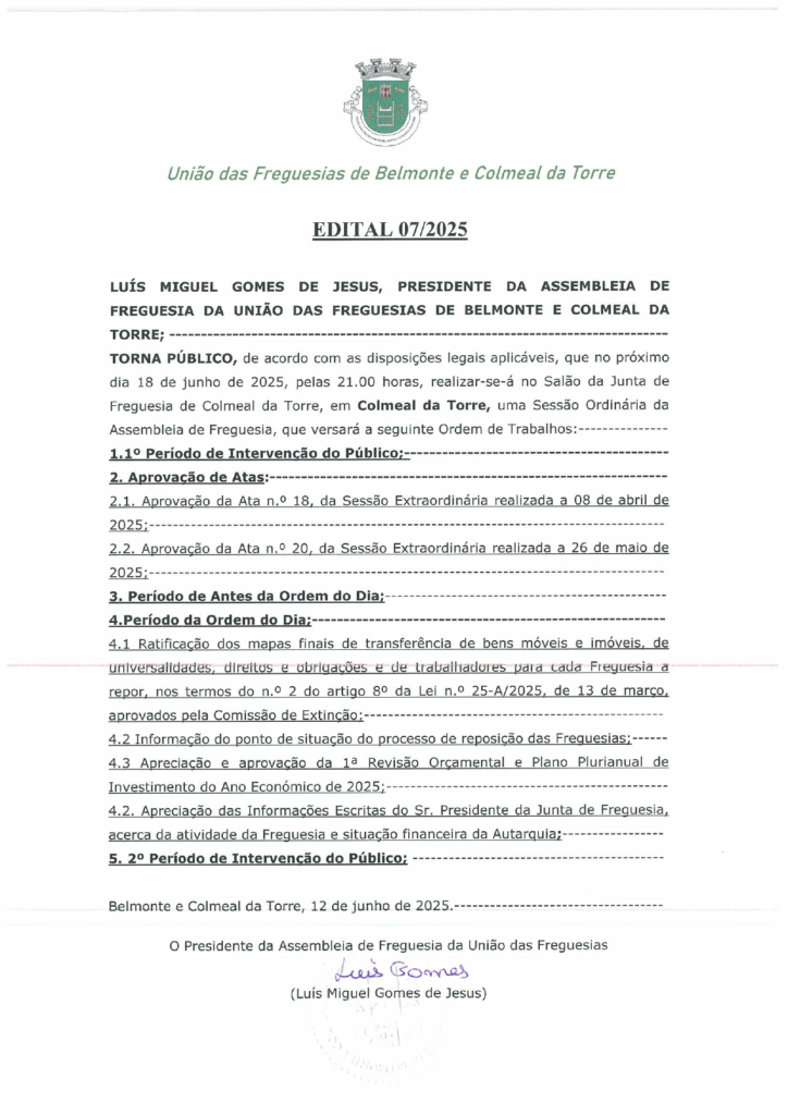 Está agendada para amanhã, dia 18 de junho de 2025, às 21h00, no Salão da Junta de Freguesia de Colmeal da Torre, uma Sessão Ordinária da Assembleia de Freguesia da União das Freguesias de Belmonte e Colmeal da Torre.