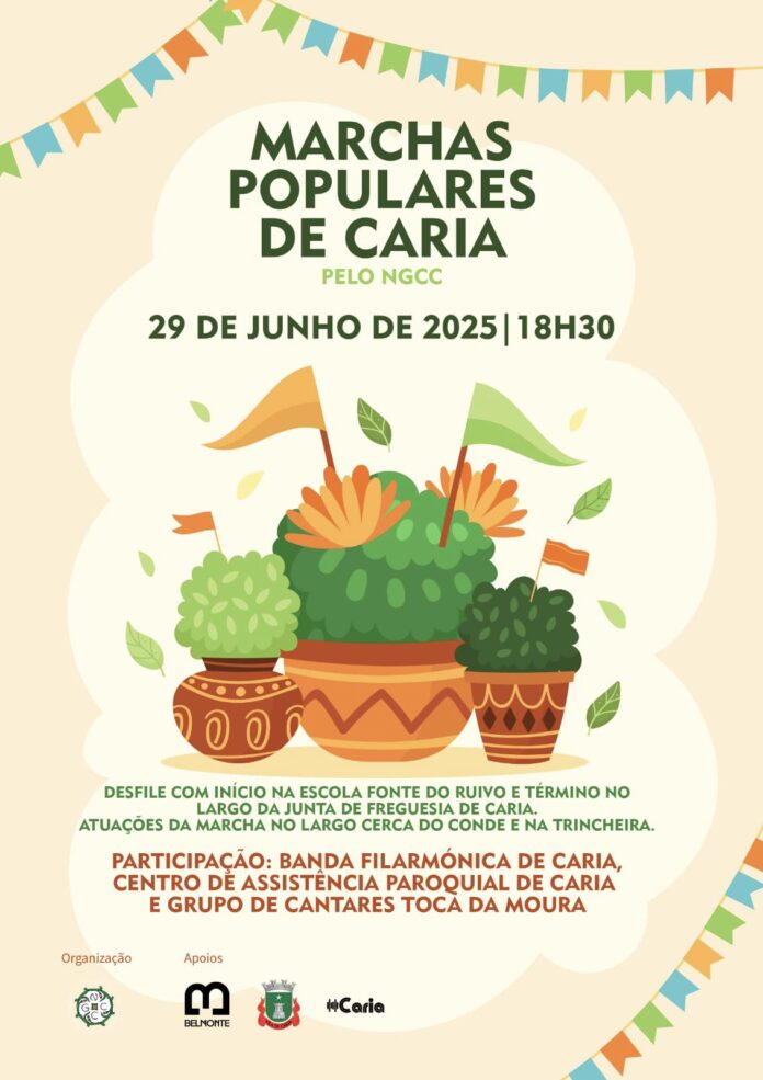 Caria prepara-se para uma tarde de animação e tradição com as Marchas Populares, que terão lugar no próximo dia 29 de junho de 2025, a partir das 18h30, numa organização do NGCC – Núcleo Gimnodesportivo de Caria.