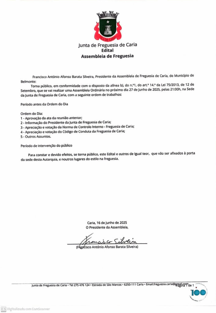 A Junta de Freguesia de Caria, no concelho de Belmonte, convocou uma Assembleia de Freguesia Ordinária que terá lugar no próximo dia 27 de junho de 2025, pelas 21h00, na Sede da Junta de Freguesia de Caria.