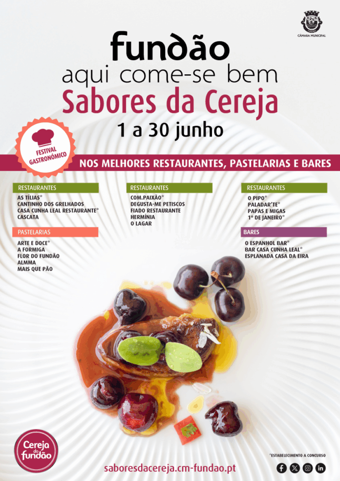 O Município do Fundão está a promover, até ao próximo dia 30 de junho, o festival gastronómico “Fundão, Aqui Come-se Bem – Sabores da Cereja”. A iniciativa, que celebra o fruto mais icónico da região, conta com a adesão de 13 restaurantes, cinco pastelarias e três bares espalhados por todo o concelho.