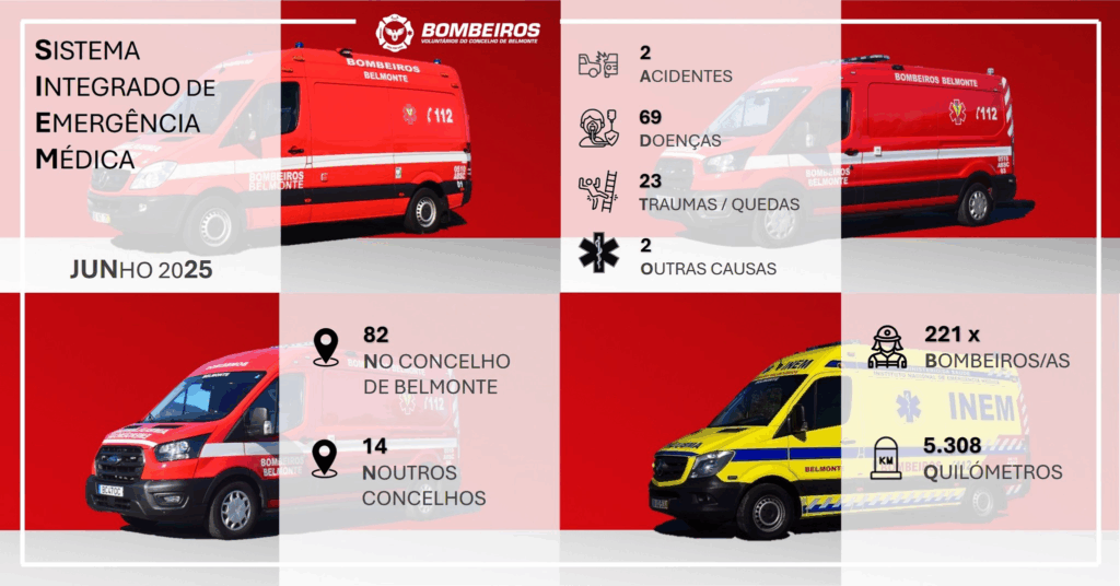 O Corpo de Bombeiros Voluntários do Concelho de Belmonte divulgou o resumo da sua atividade operacional referente ao mês de junho e ao acumulado do primeiro semestre de 2025, no âmbito das solicitações recebidas através do Sistema Integrado de Emergência Médica (vulgo 112).