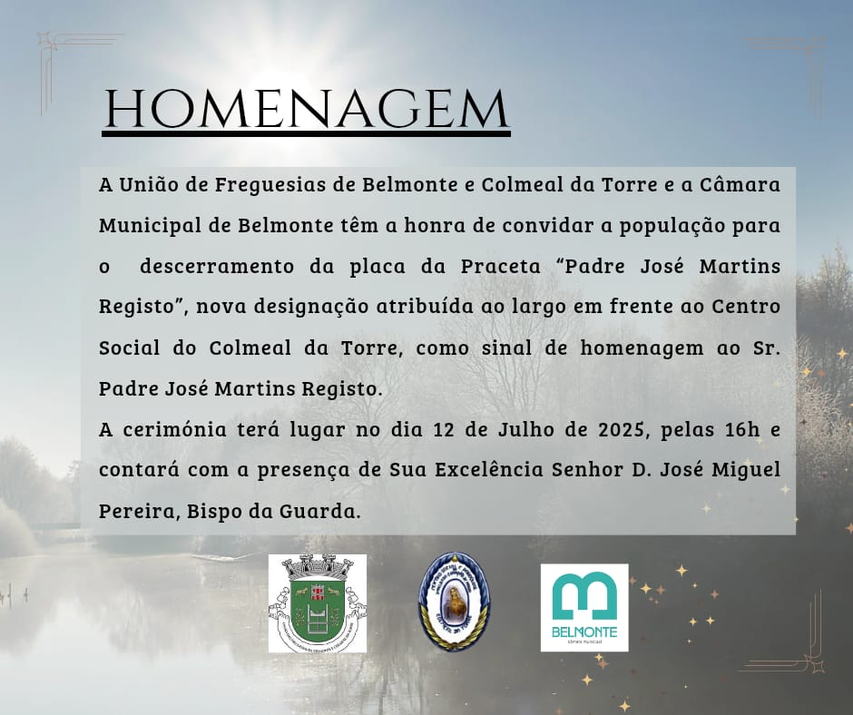 A União de Freguesias de Belmonte e Colmeal da Torre, em colaboração com a Câmara Municipal de Belmonte, organiza uma cerimónia de homenagem ao Sr. Padre José Martins Registo, marcada para o próximo dia 12 de julho, pelas 16h.
