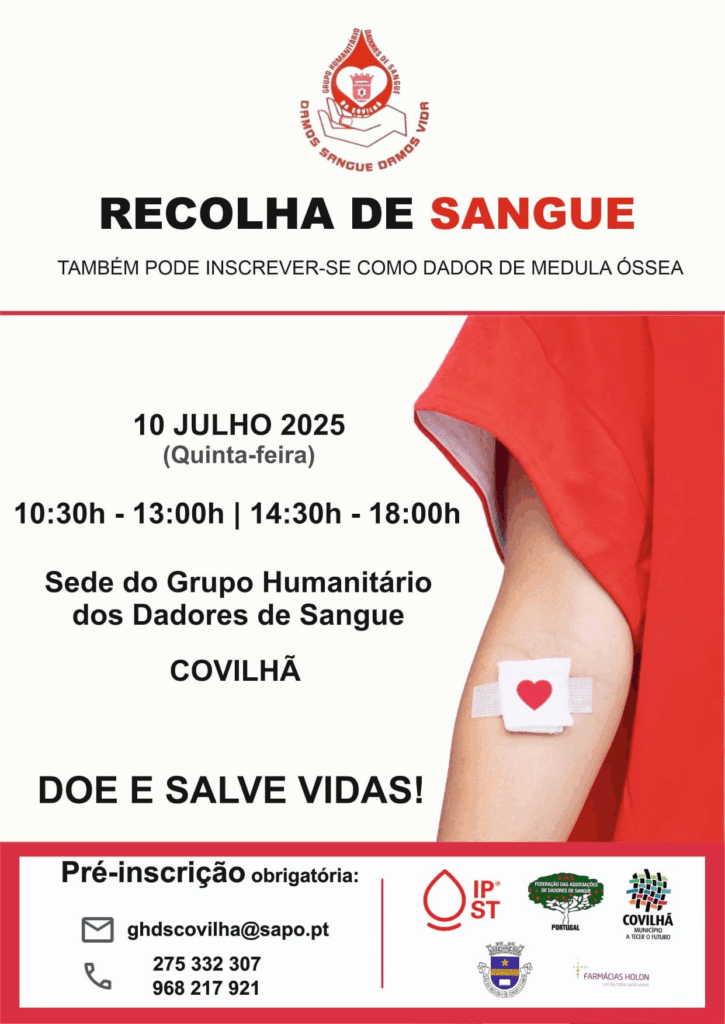 O Grupo Humanitário dos Dadores de Sangue da Covilhã promove no próximo dia 10 de julho de 2025 (quinta-feira) mais uma ação de recolha de sangue, com possibilidade de inscrição como dador de medula óssea.