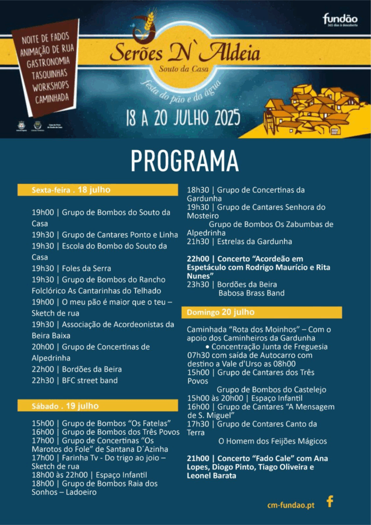 A aldeia de Souto da Casa, no concelho do Fundão, recebe de 18 a 20 de julho a edição 2025 dos “Serões N’Aldeia – Festa do Pão e da Água”. O evento promete três dias de animação com música tradicional, tasquinhas, animação de rua, oficinas e atividades para toda a família.