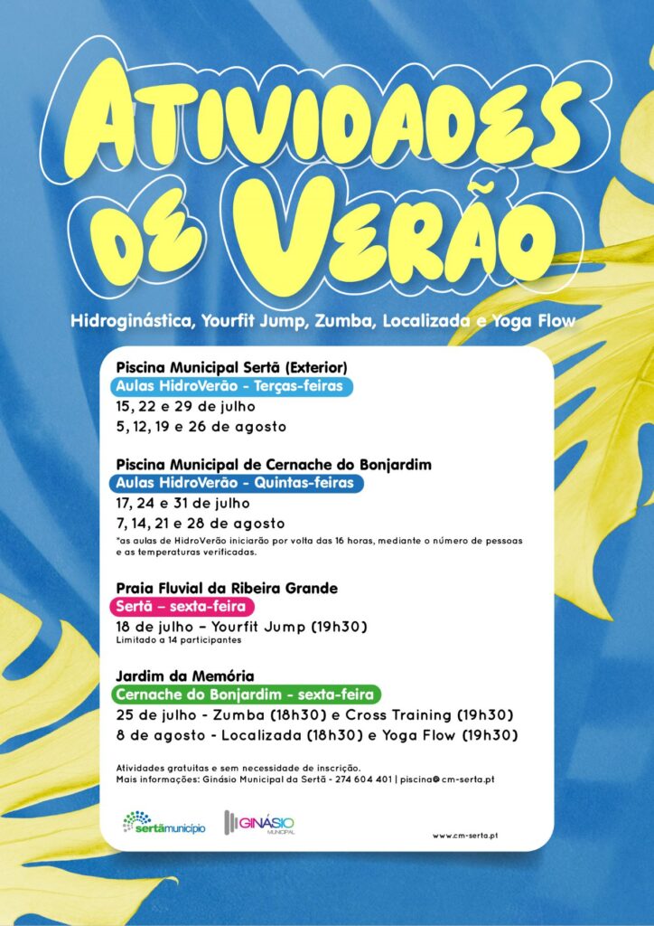 Relembramos que a participação nestas atividades é gratuita e sem necessidade de inscrição. Para mais informações, os interessados deverão contactar o Ginásio e a Piscina Municipal através do telefone 274 604 401, ou do e-mail piscina@cm-serta.pt.