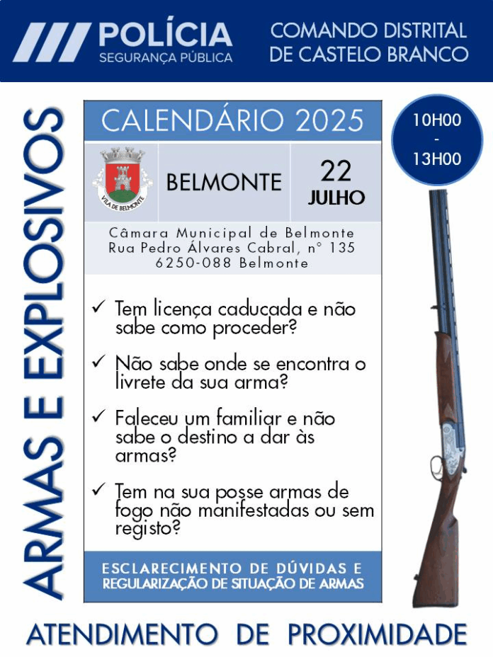 O Comando Distrital da PSP de Castelo Branco vai promover uma ação de atendimento de proximidade no âmbito da campanha “Armas em Segurança – Tour de Verão”. A iniciativa terá lugar no próximo dia 22 de julho, entre as 10h00 e as 13h00, no edifício da Câmara Municipal de Belmonte.