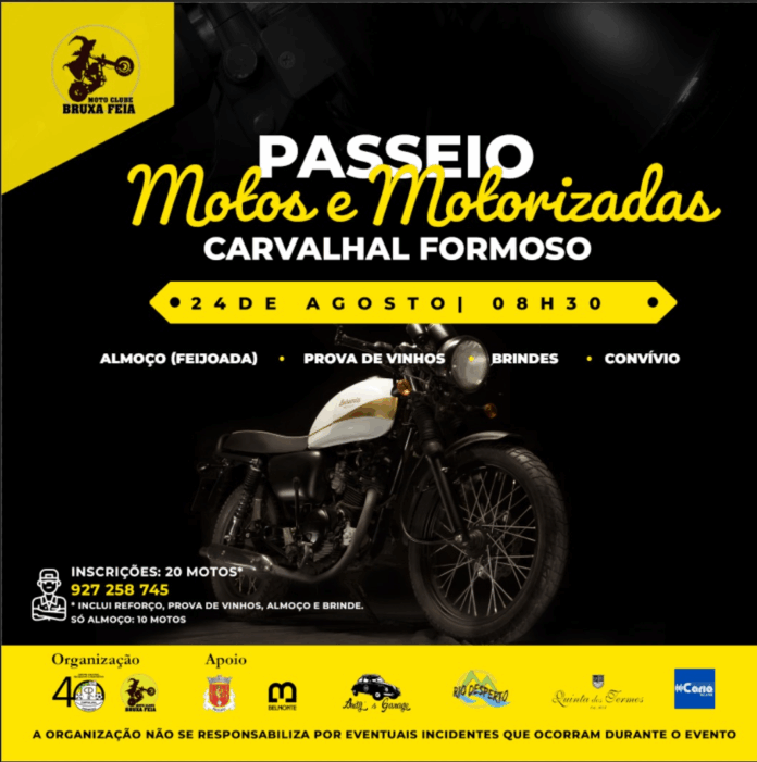O Moto Clube Bruxa Feia está a organizar um Passeio de Motos e Motorizadas, agendado para o dia 24 de agosto, em Carvalhal Formoso. O evento promete juntar os entusiastas das duas rodas para um dia de convívio e paixão pelo motociclismo.