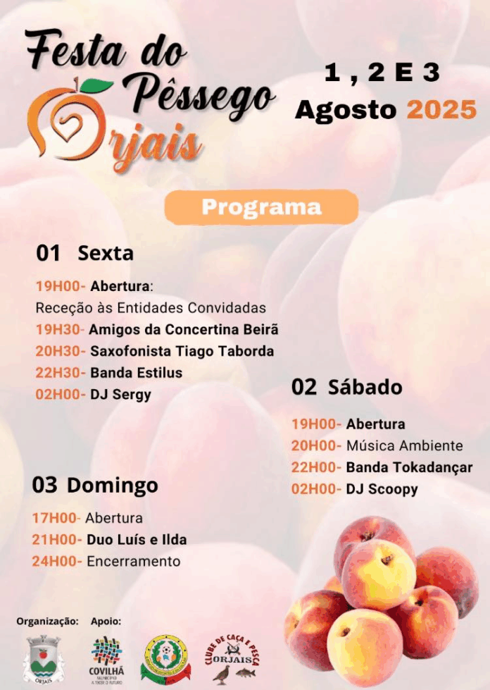 A aldeia de Orjais, no concelho da Covilhã, prepara-se para receber mais uma edição da sua tradicional Festa do Pêssego. O evento, que celebra o fruto emblemático da região, decorrerá nos dias 1, 2 e 3 de agosto e promete três dias repletos de música e animação.