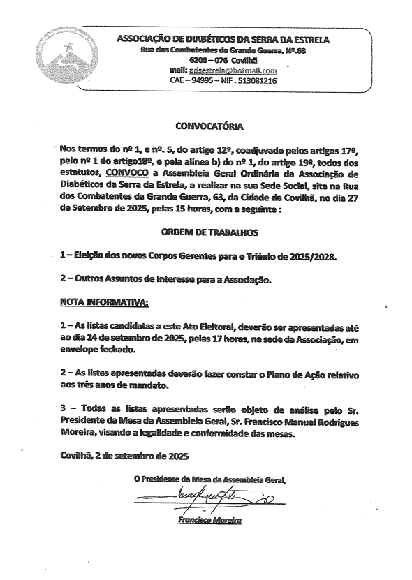 A Associação de Diabéticos da Serra da Estrela (ADSE) vai eleger os seus novos corpos gerentes para o triénio 2025/2028. O ato eleitoral está marcado para o próximo dia 27 de setembro, durante a Assembleia Geral Ordinária convocada para o efeito.