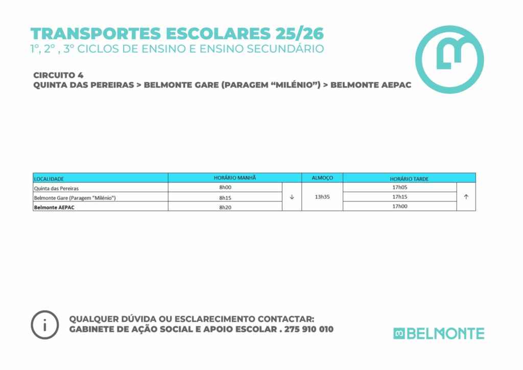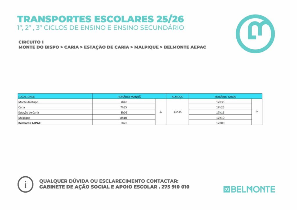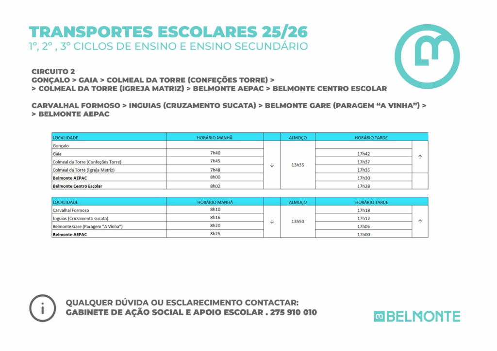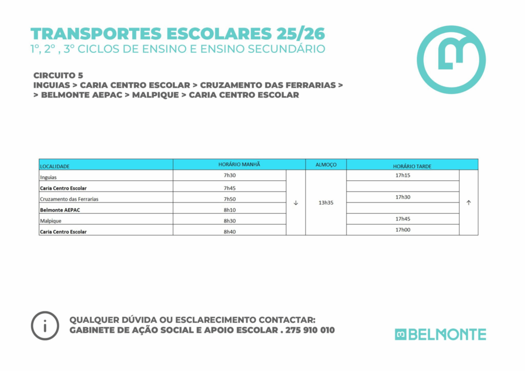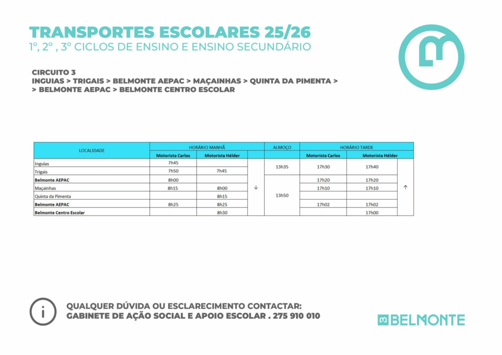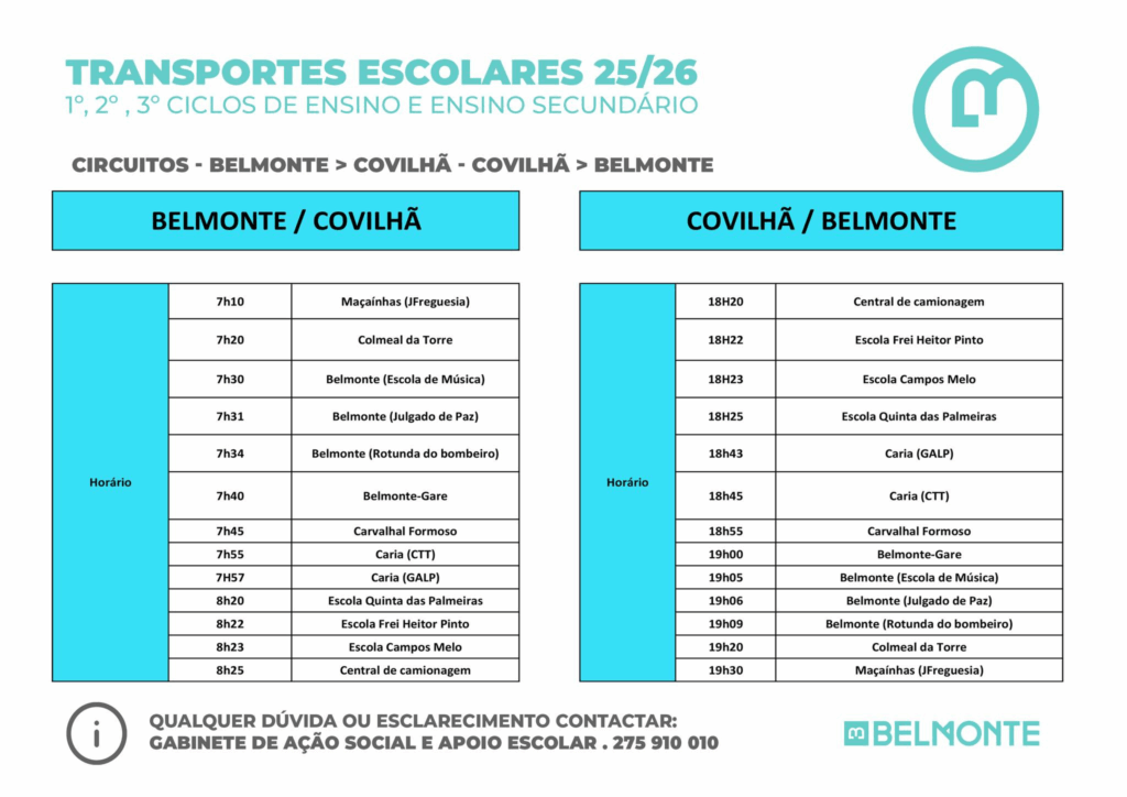Foram divulgados os horários dos Transportes Escolares para o ano letivo de 2025/2026, abrangendo os circuitos no Concelho de Belmonte e as ligações para os estudantes que frequentam estabelecimentos de ensino na Covilhã.