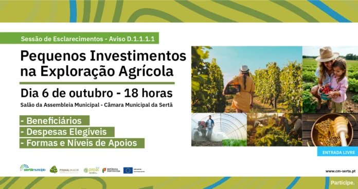 No próximo dia 6 de outubro, às 18 horas, a Pinhal Maior, em parceria com a Câmara Municipal da Sertã, vai dinamizar uma sessão de esclarecimentos, relativa ao aviso D.1.1.1.1 – Pequenos Investimentos na Exploração Agrícola.