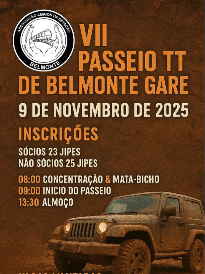 A lama e a aventura estão de regresso com a organização do VII Passeio TT de Belmonte Gare, agendado para o dia 9 de novembro de 2025. O evento, promovido pela Associação Amigos da Estação, promete reunir dezenas de jipes e entusiastas da modalidade para um dia de convívio e percursos desafiantes.