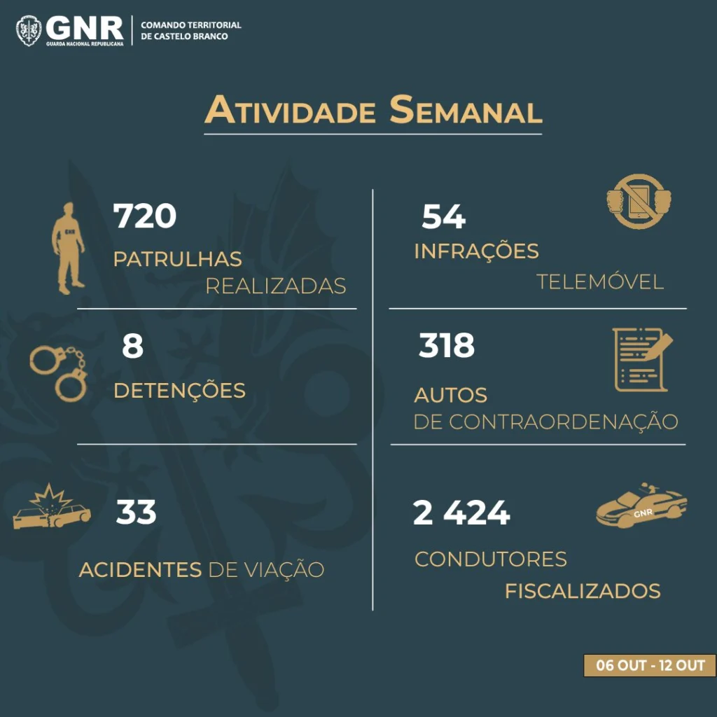 O Comando Territorial de Castelo Branco da GNR efetuou, entre os dias 6 e 12 de outubro, um total de oito detenções e fiscalizou 2.424 condutores, no âmbito das suas operações de patrulhamento e prevenção da criminalidade no distrito.